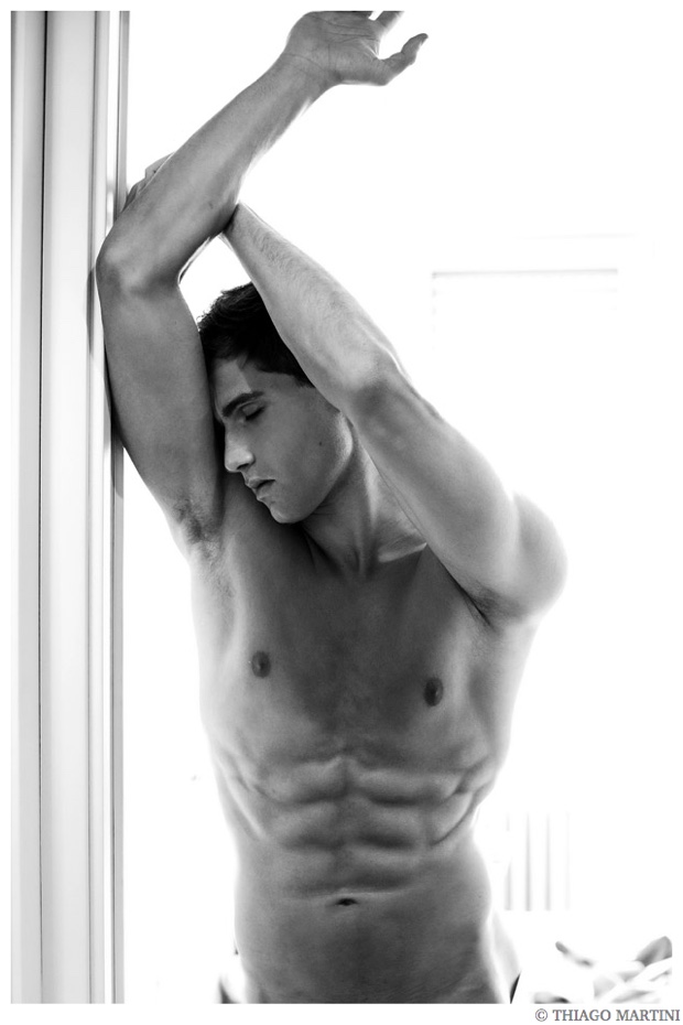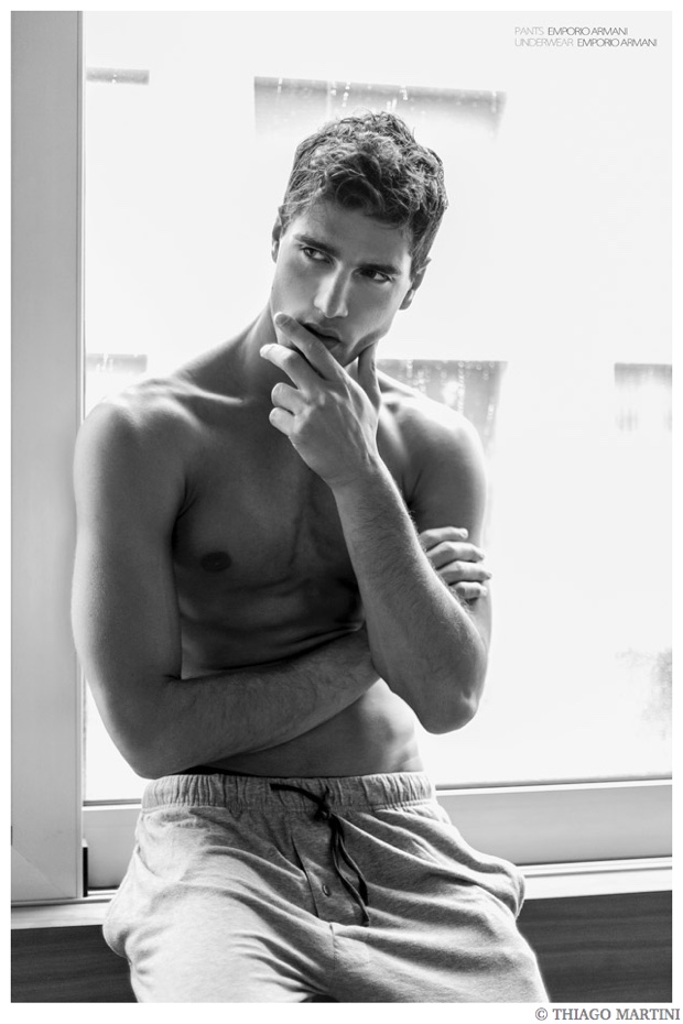 Connecting with photographer Thiago Martini, Italian model Fabio Mancini stars in a serene black & white shoot. Minimal in nature, Fabio is captured indoors as he relaxes in simple denim jeans and underwear from Emporio Armani.